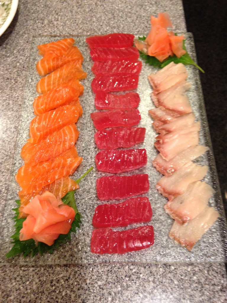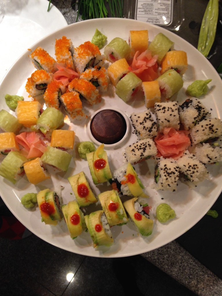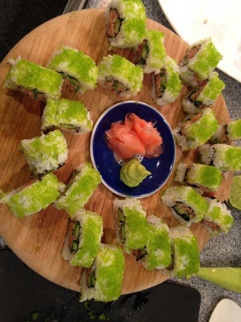 I had asked my husband what he wanted me to make for his birthday dinner party, thinking he would say steaks or lamb and out came SUSHI! His eyes lit up at the thought of doing a Japanese style dinner and I became slightly nervous. How was I going to pull of making fresh sushi for 14 people after only making it once in culinary school?? Well let me tell you folks its all about the rice!! The rolling part gets easier and faster after doing the first couple rolls but the rice is key.